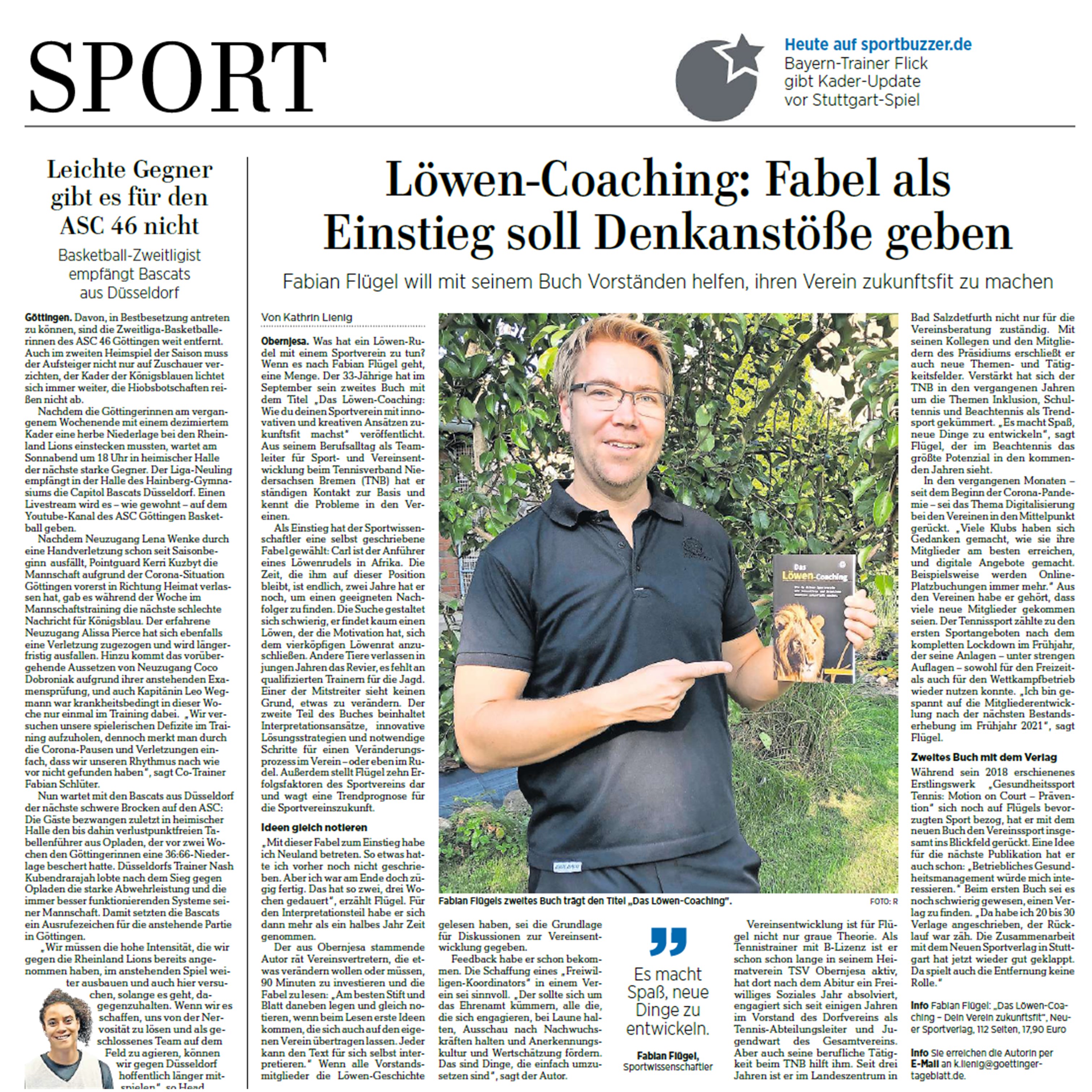 „Sportverein – für alle ein Gewinn. Der Slogan vom Deutschen Olympischen Sportbund sagt im Kern aus, was für Fabian Flügel die Motivation für sein Buch „Das Löwen-Coaching“ ist. Warum schenken Menschen ihre Freizeit anderen Sport treibenden Menschen? Die Löwen geben darauf Antworten. Wie bringe ich ein Löwenrudel in eine sichere und gute Zukunft? Wie gestalte ich in